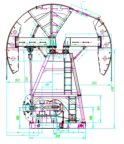 雙井聯(lián)動(dòng)式抽油機(jī)主要由主驢頭、副驢頭、支架、主游梁、副游梁、連桿、橫梁、曲柄、減速器、底座、剎車機(jī)機(jī)構(gòu)、電動(dòng)機(jī)裝置、主吊繩 、副吊繩以及地腳螺栓等組成。另外還有諸如連接裝置、固定螺桿等除附件組成。